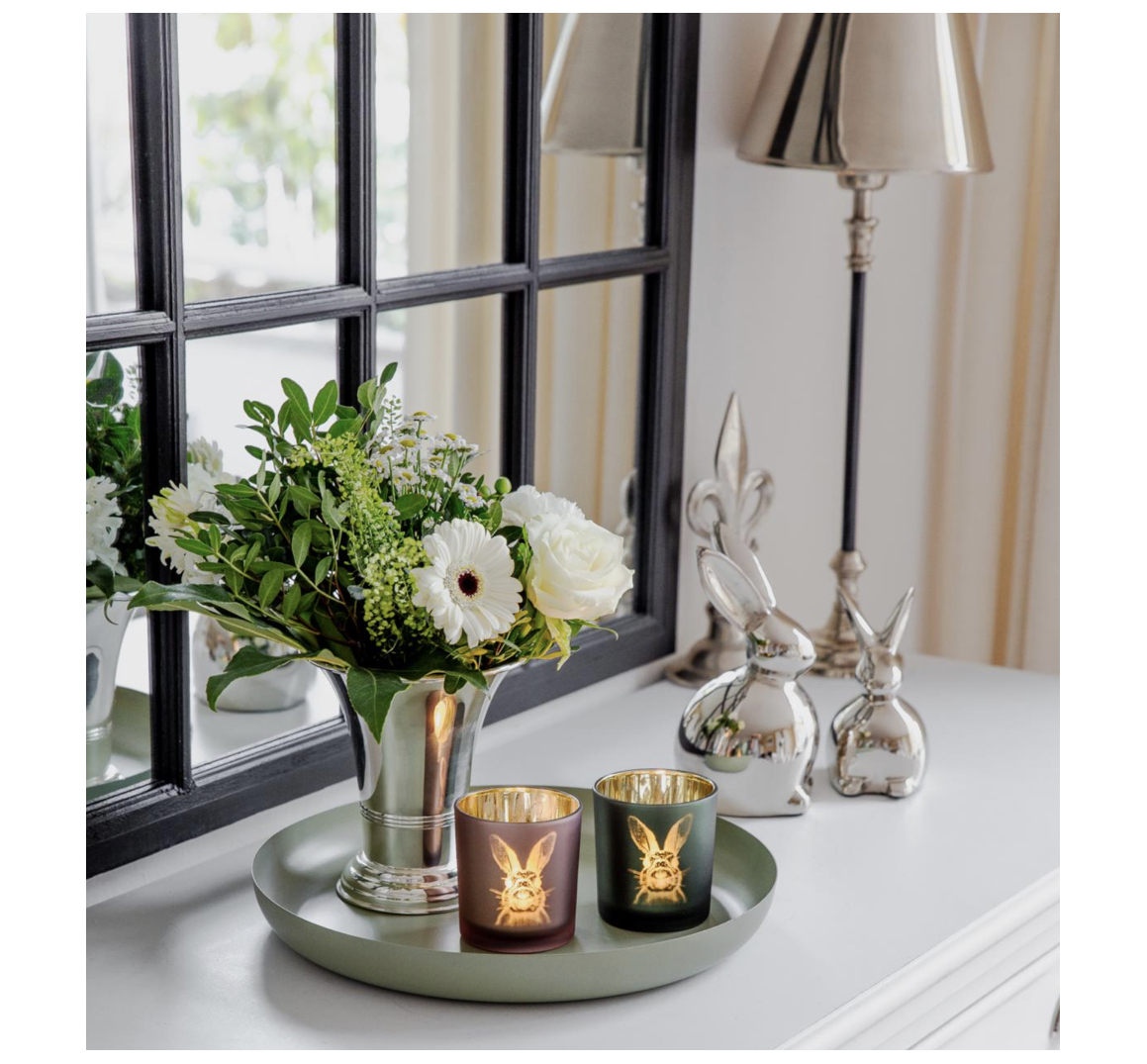 Das 2er Set der Glas-Windlichter BUNNY mit Hasenmotiv in rosé und innen gold von Edzard aus Bremen setzt einen osterlichen und zugleich eleganten Akzent im Haus oder auch draußen.
