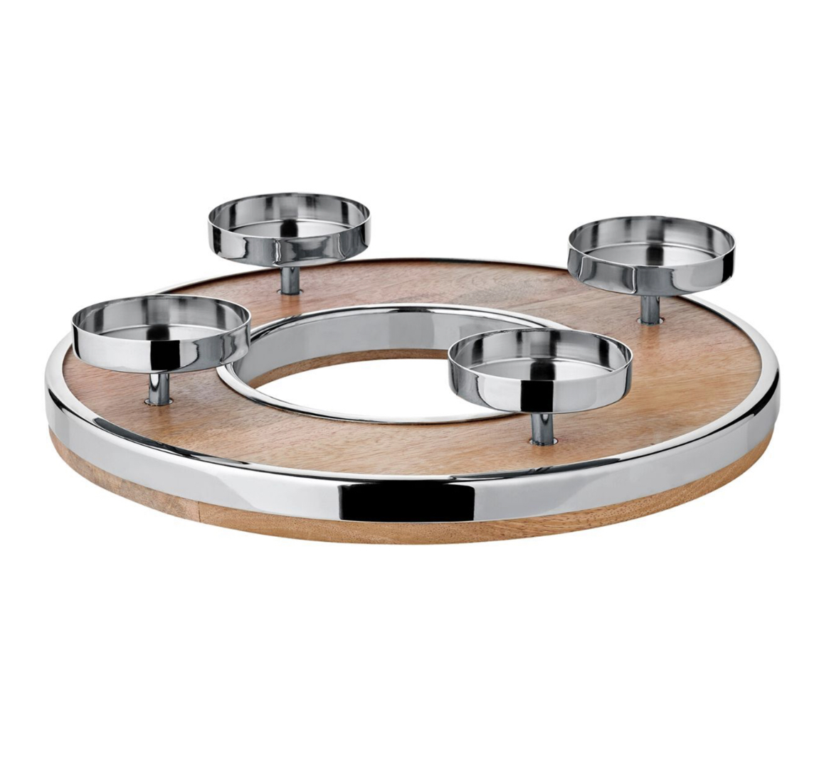 Mit jedem Adventssonntag und jeder Kerze rückt die schöne freie Weihnachtszeit mit der Familie und den Freunden näher, und der Adventskranz JALE aus Mangoholz mit Edelstahlrand sorgt für eine wunderbare, einzigartige Optik und eine schöne Lichtquelle. Der Kranz verfügt über vier eingearbeiteten Kerzenteller, die für ein sicheres Abbrennen der Kerzen sorgen.