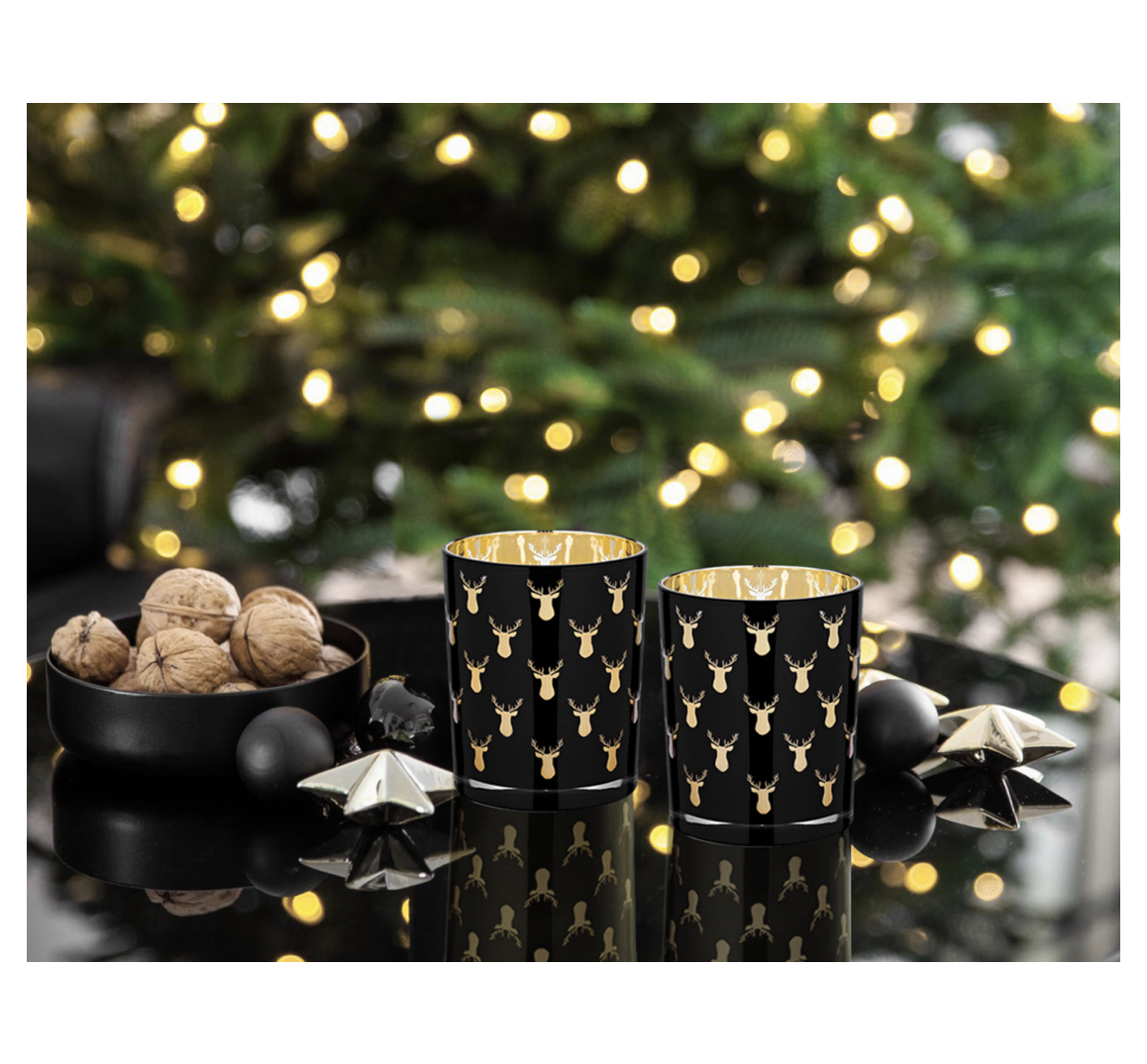 Das 2er Set der Glas-Windlichter ROSY mit Hirsch-Motiv von Edzard aus Bremen setzt einen winterlich festlichen Akzent im Haus oder auch draußen.