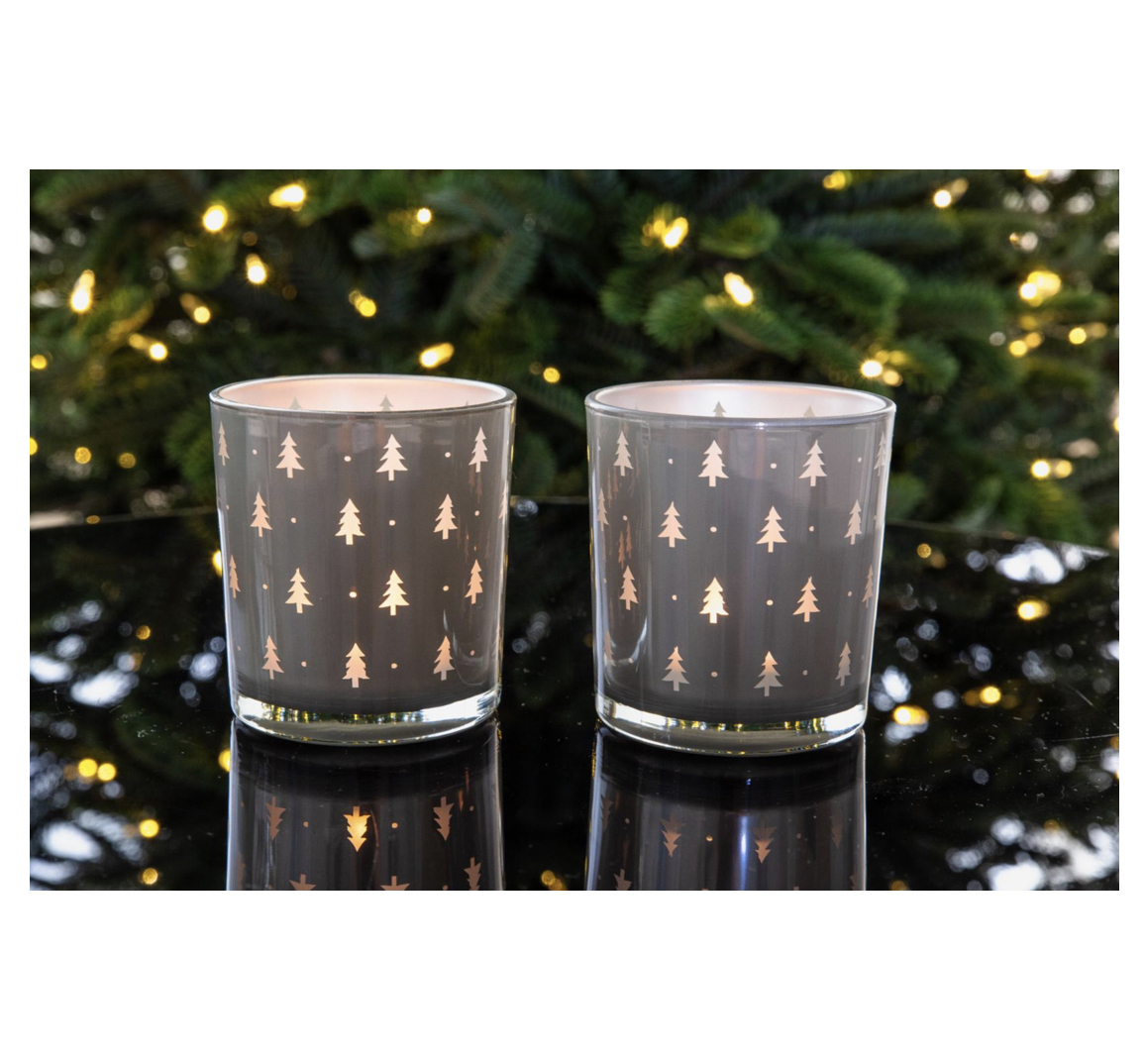 Das 2er Set der Glas-Windlichter TANI mit Tannenbaumtmotiv von Edzard aus Bremen setzt einen winterlichen und zugleich eleganten Akzent im Haus oder auch draußen.