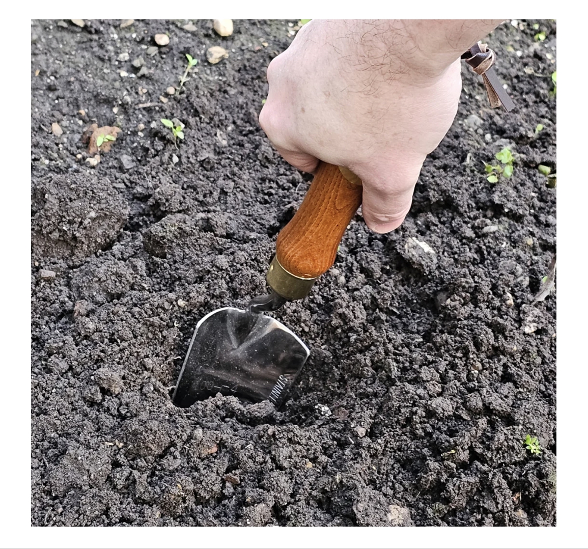 Die schmale Edelstahlkelle mit eingravierter Skala erleichtert das präzise Pflanzen von Blumenzwiebeln oder kleinen Setzlingen, während der komfortable Griff aus Eschenholz ein angenehmes Arbeiten ermöglicht.