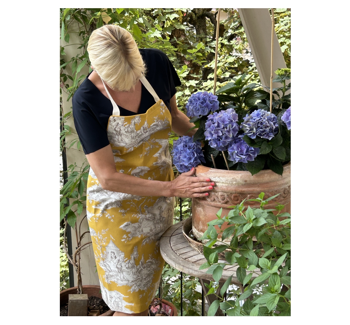 Aus der AÏDA SANCHEZ HOME COLLECTION, diese JOILE DE JOUY Schürze in einem satten Senfgelb-Ton ist eine wunderschöne Accessoire in jeder Küche beim Kochen oder Backen; sie ist aber robust genug für leichte Arbeiten im Garten.