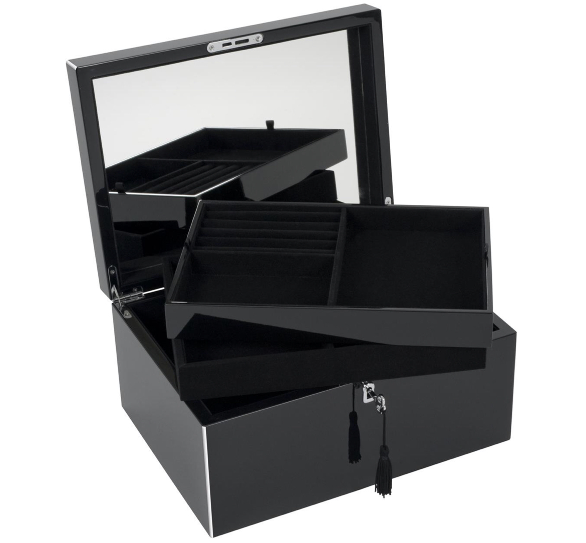 Der wunderschöne Schmuckkasten TANG BLACK von Gift Company in edlem Schwarz ist mit einem großen Spiegel und zwei herausnehmbaren Fächern ausgestattet. Und auch mit einem Schloss, um Schätze wahrhaftig schützen zu können.