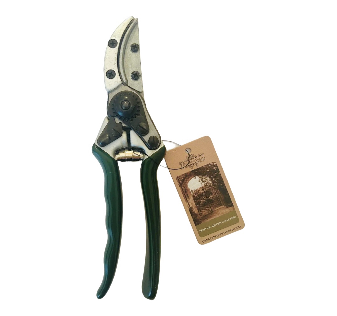 Die Klinge der Rosenschere ist aus Edelstahl; die Anti-Rutsch-PVC-Beschichtung des Griffs ist in traditionellem "Racing Green".
